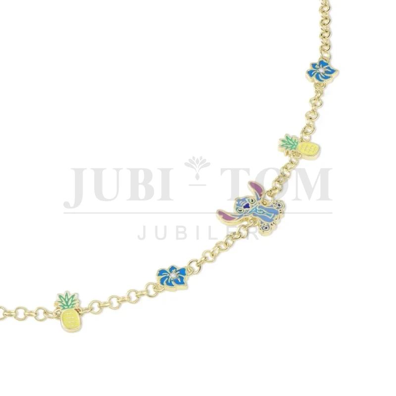 Detale: Bransoletka ozdobiona uśmiechniętym Stitchem, tropikalnymi ananasami oraz kwiatami hibiskusa z błyszczącymi cyrkoniami.
