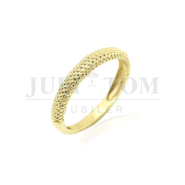 Elegancja w czystej formie złota. Ten subtelny pierścionek od Jubi-Tom Jubiler to idealna propozycja dla kobiet ceniących minimalistyczną, a jednocześnie przyciągającą wzrok biżuterię. Dzięki unikalnej, fakturowanej powierzchni (wzór drobnych kulek), pierścionek przepięknie rozprasza światło przy każdym ruchu dłoni, tworząc efektowny blask bez użycia kamieni.