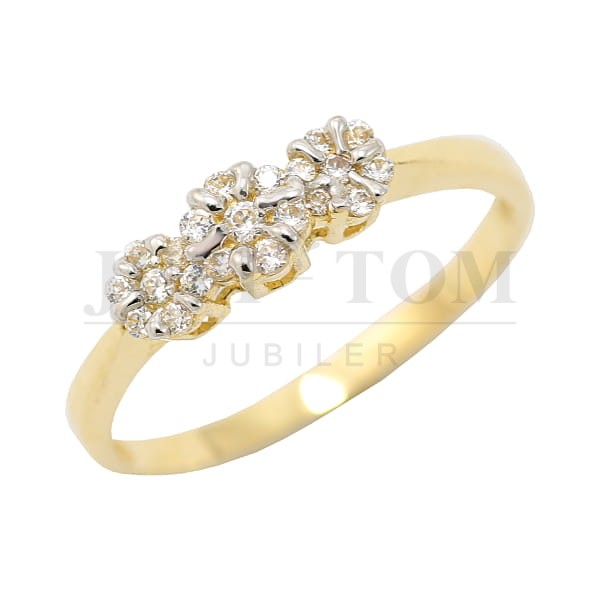 Subtelność spotyka się z doskonałością. Ten delikatny pierścionek od Jubi-Tom Jubiler to pochwała kobiecości, wyrażona poprzez potrójny motyw kwiatowy. Wykonany z lśniącego żółtego złota, został ozdobiony precyzyjnie wyselekcjonowanymi cyrkoniami Swarovski, które gwarantują blask godny najszlachetniejszych kamieni.