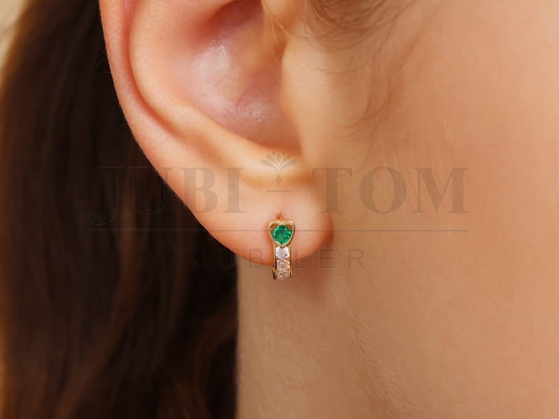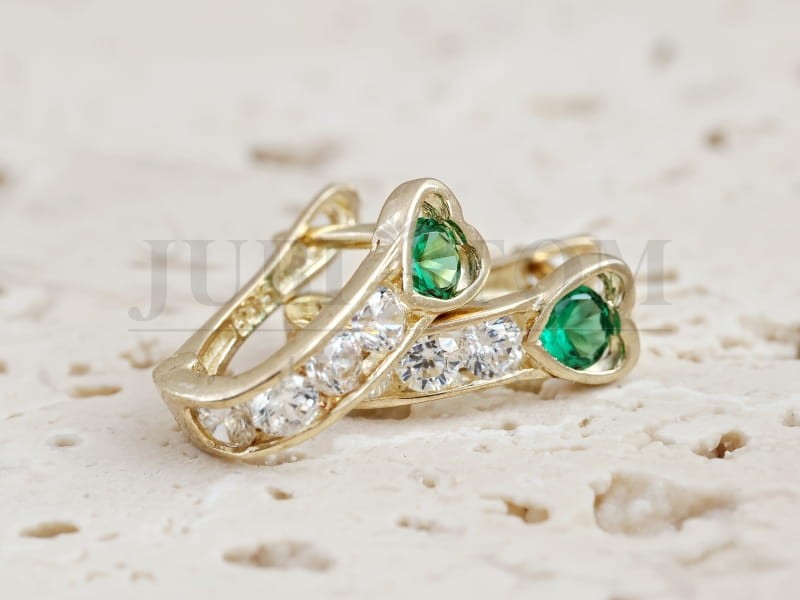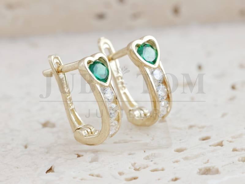 Kolczyki złote z białymi cyrkoniami i zieloną cyrkonią w serduszku