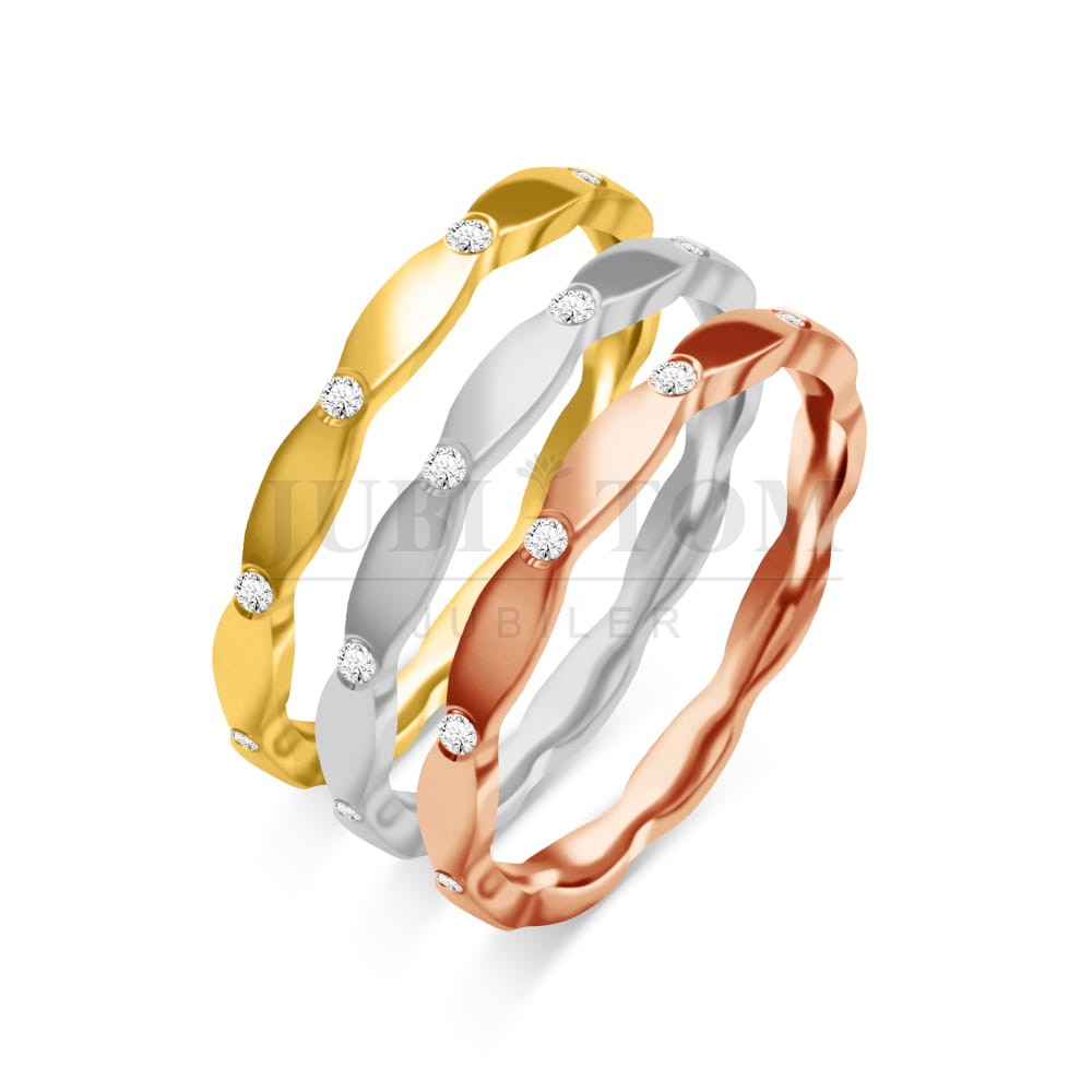 Obrączka o nieregularnym kształcie z kamieniami złoto proby 585