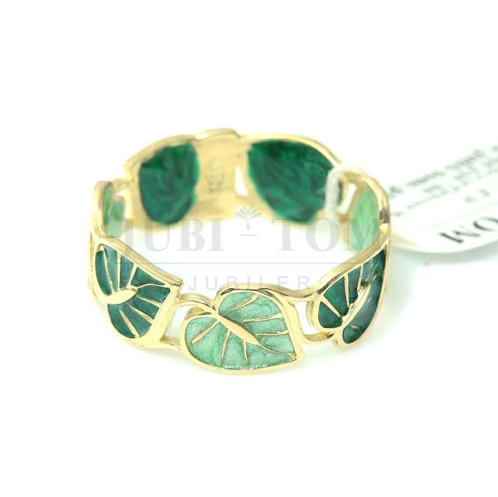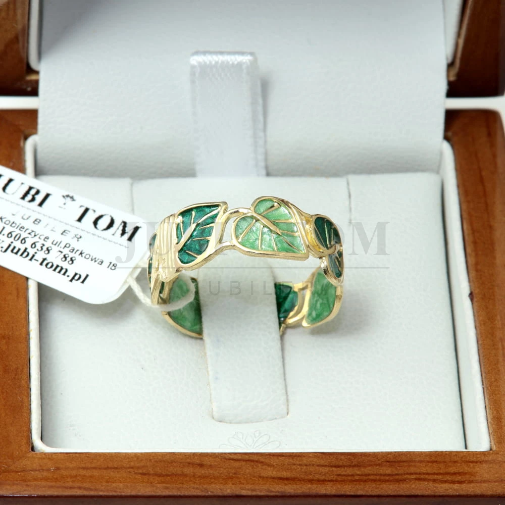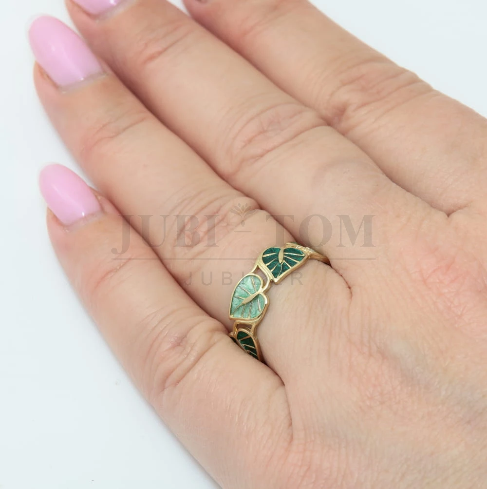 Pierścionek liście monstera z zieloną emalią -a'la obrączka próba 585