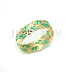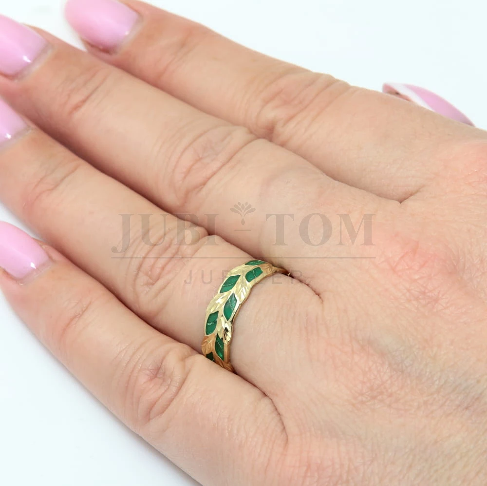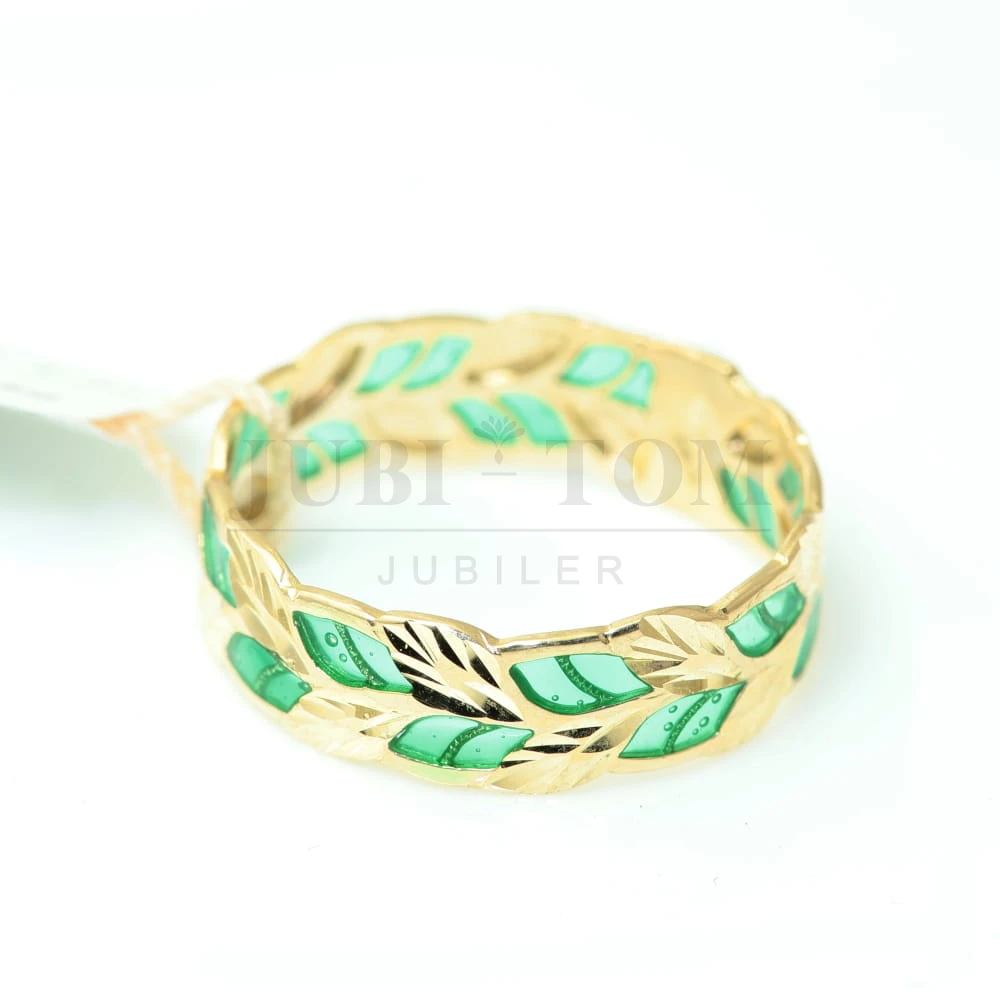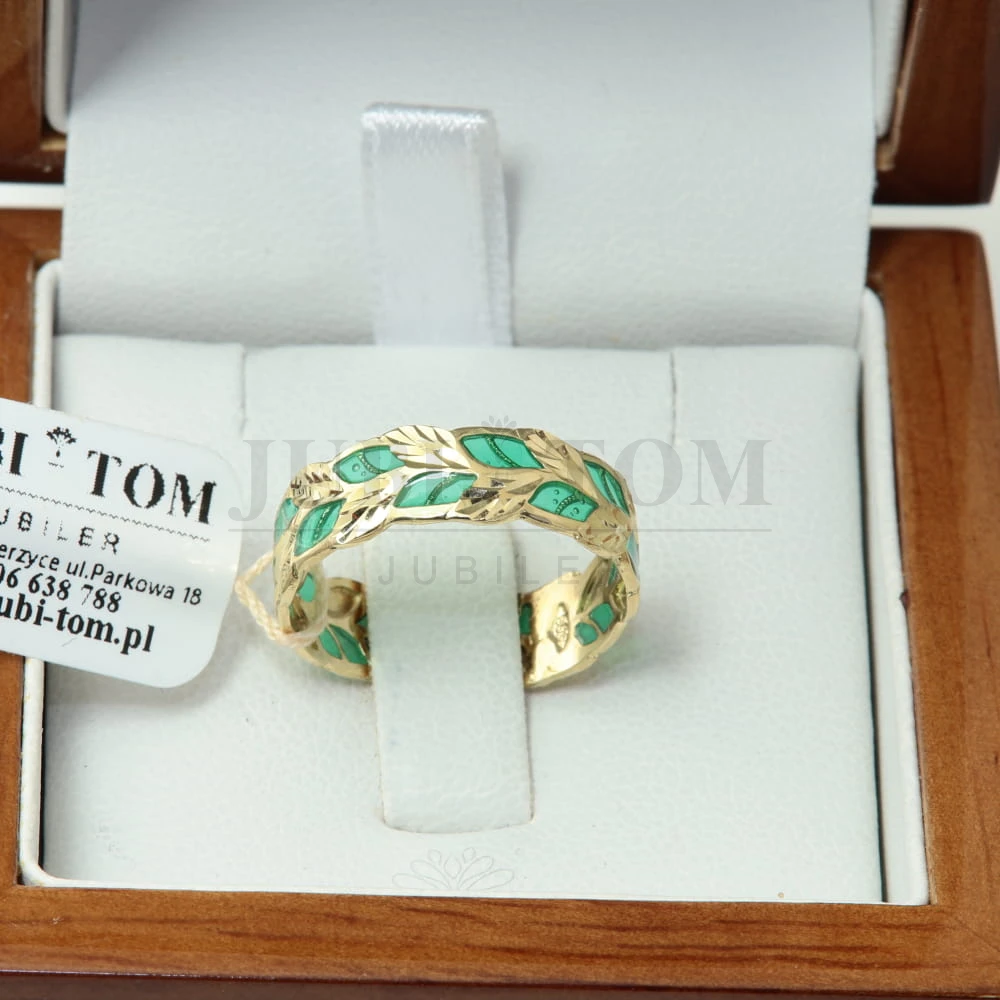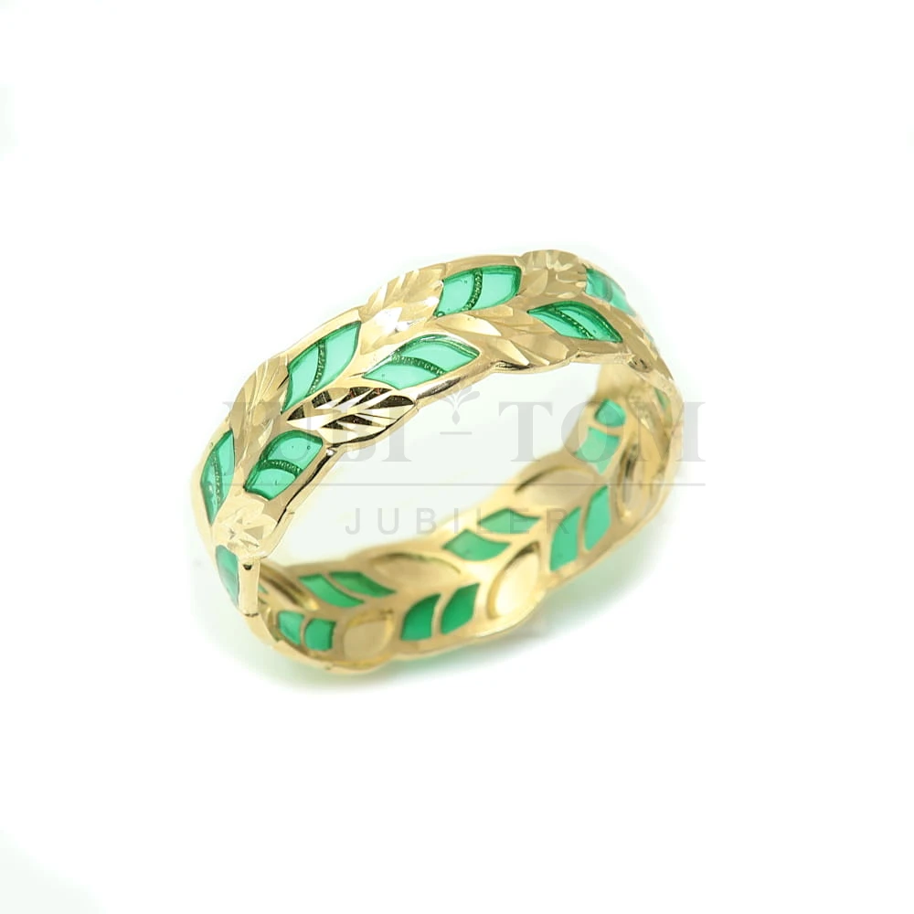 Pierścionek liście z zieloną emalią a'la obrączka próba 585