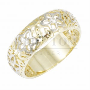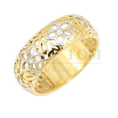 Pierścionek złoty z ażurowymi kwiatkami, cześć kwiatków rodowana białym złotem