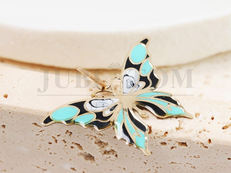 Poczuj lekkość i kolor. Ta zachwycająca zawieszka w kształcie motyla to idealne połączenie klasycznego złota i nowoczesnego designu. Skrzydła motyla zostały wypełnione wysokiej jakości emalią w odcieniach intensywnego turkusu oraz marmurkowa bieli, które kontrastują z czarnymi detalami. Złote obramowanie próby 585 pięknie domyka całość, nadając biżuterii szlachetnego blasku.