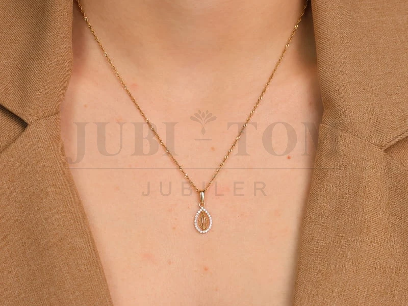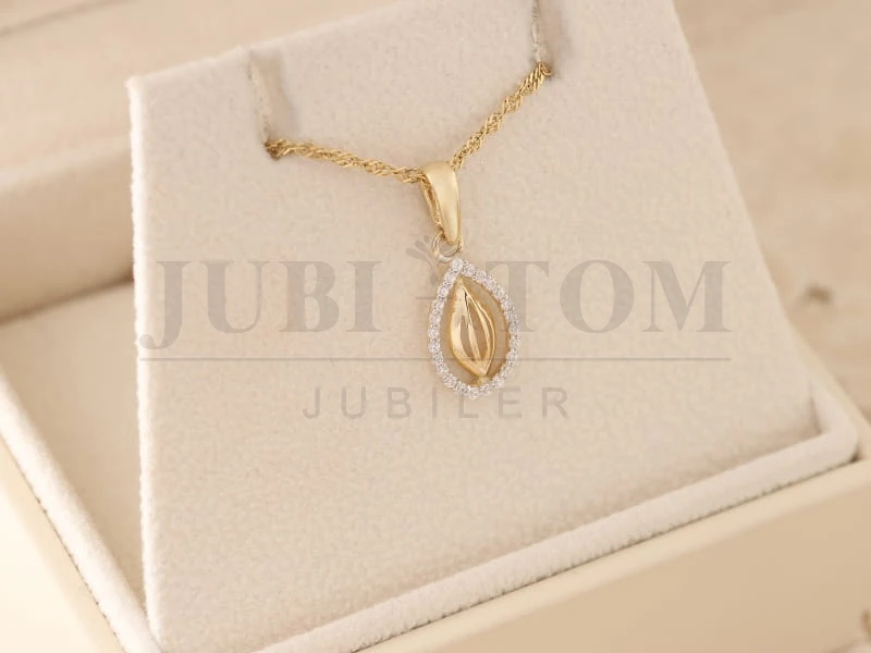 Subtelność i luksus w jednym. Ta wyjątkowa zawieszka w kształcie migdała została wykonana w całości z lśniącego, żółtego złota próby 585. Jej serce stanowi gładki, polerowany element, który został oprawiony w misterną obwódkę wysadzaną maleńkimi, mieniącymi się cyrkoniami.